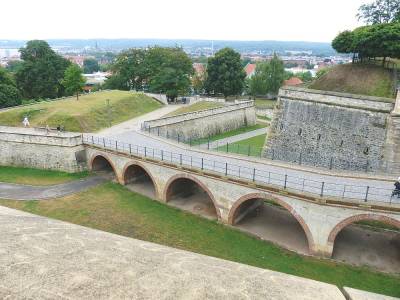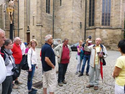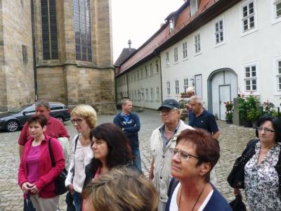 Nach der Abreise morgens in Leipzig fuhr uns Wolfgang Roth nach Erfurt. Am Domplatz wartete ein Stadtführer. Zuerst ging es zur Zitadelle Petersberg oberhalb der Altstadt. Der Mainzer Erzbischof Johann Philipp von Schönborn errichtete sie 1655 als sichtbares Zeichen seiner Macht gegenüber der Stadt. Bis zum Ende der DDR waren dort militärische Einrichtungen.