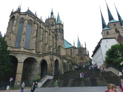 Wahrzeichen von Erfurt ist das Ensemble auf dem Domplatz mit dem Dom und Severi-Kirche. Die mächtigste Glocke, die Gloriosa, des Doms ist 2,54 Meter hoch und wiegt mehr als 11 Tonnen. Sie darf nur noch zu besonderen Anlässen geläutet werden. Der Erfurter Dom, früher Marienkirche, war nur kurz Bischofssitz und wurde ab 1994 erneut Kathedrale des neuen Bistums Erfurt. Ab 1154 wurde mit dem Neubau des romanischen Domes begonnen. Um 1300 begann die gotische Bauphase. Der Dom wurde mit Seeberger Sandstein errichtet. Die St. Severikirche steht unmittelbar neben dem Dom. Wie der Dom ist sie eine Mischung zwischen Romanik und gotischem Neubau.